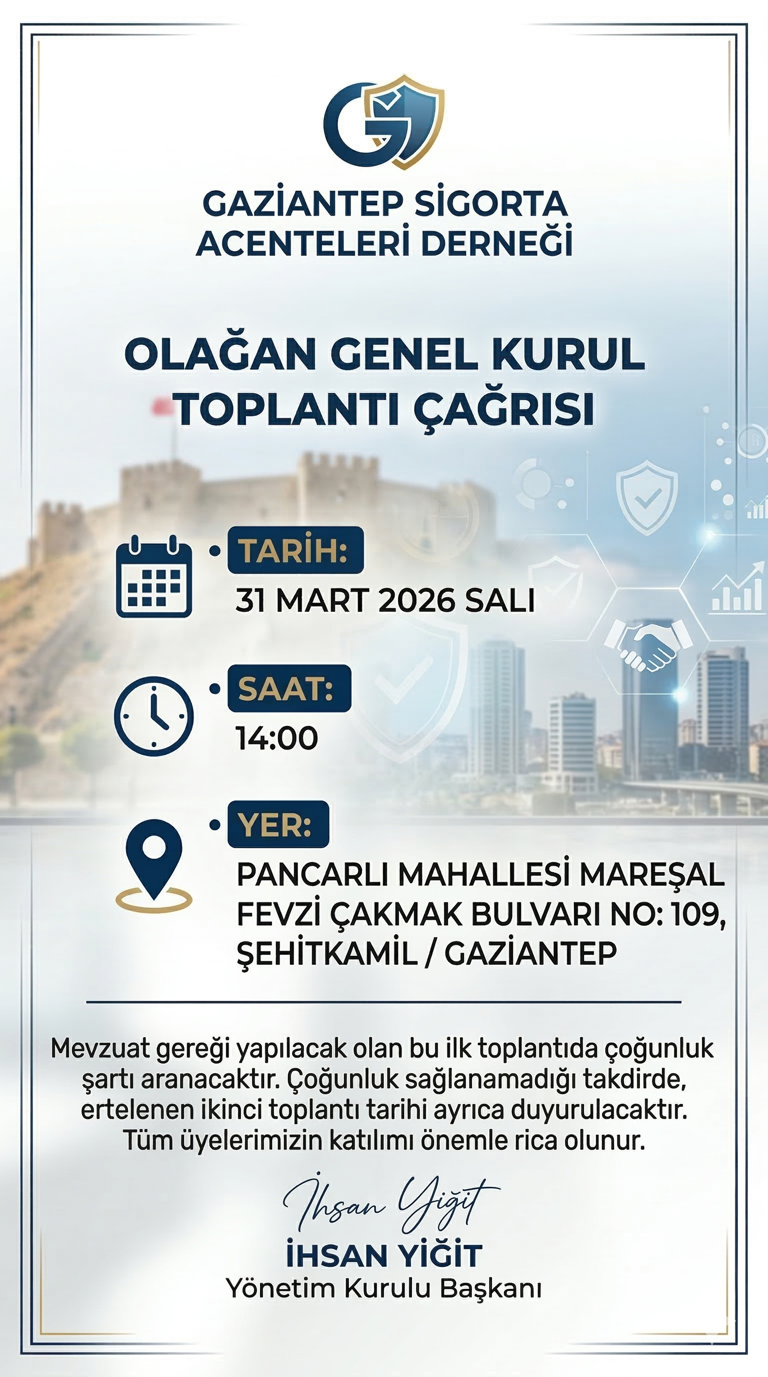 İLAN GAZİANTEP SİGORTA ACENTELERİ DERNEĞİ YÖNETİM KURULU BAŞKANLIĞINDAN GENEL KURUL TOPLANTI ÇAĞRISI